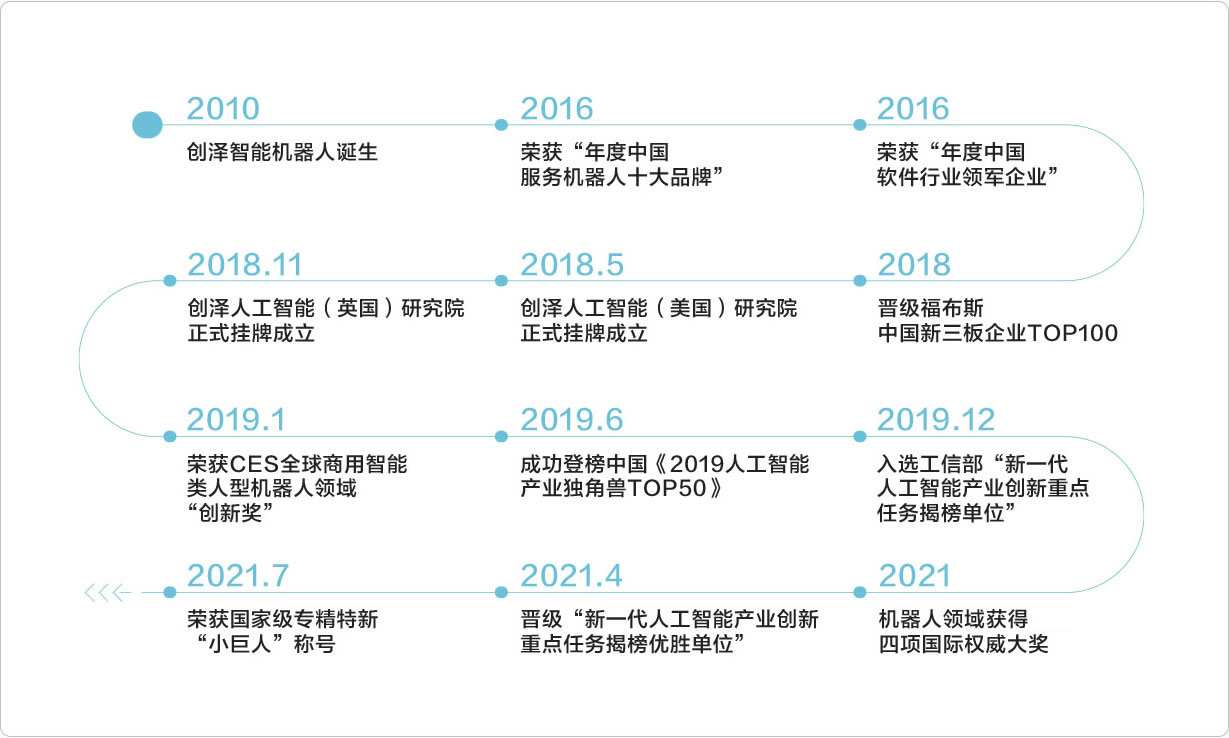 創(chuàng)澤智能機(jī)器人集團(tuán)股份有限公司成立于2010年,是集研發(fā)、生產(chǎn)、銷售于一體的國家高新技術(shù)企業(yè)、是工業(yè)和信息化部“新一代人工智能產(chǎn)業(yè)創(chuàng)新重點(diǎn)任務(wù)”揭榜單位與優(yōu)勝單位、榮獲吳文俊人工智能科技進(jìn)步獎(jiǎng)、國家專精特新“小巨人”稱號(hào),擔(dān)負(fù)著為國家開展智能公共服務(wù)機(jī)器人項(xiàng)目技術(shù)攻關(guān)的使命。全球榮獲CES創(chuàng)新獎(jiǎng)的商用類人型智能服務(wù)機(jī)器人企業(yè)、中國智能服務(wù)機(jī)器人領(lǐng)軍企業(yè)。