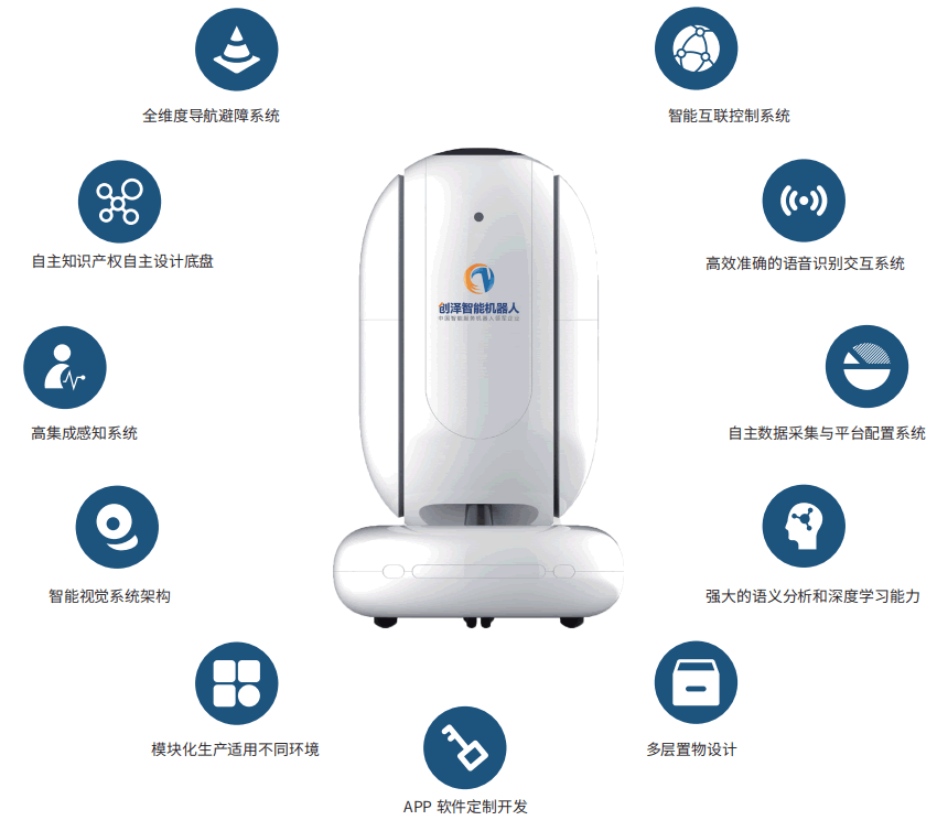采用創(chuàng)創(chuàng)的穩(wěn)定底盤,實現(xiàn)自主導(dǎo)航行走功能,D部的觸摸屏幕不僅便于用戶操作,搭配呆萌的表情,使人機交互更具親和力。其中擺放的三層置物架,采用環(huán)保J材質(zhì),可實現(xiàn)自主送餐送貨功能。