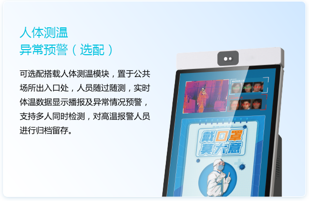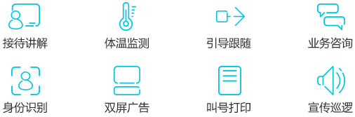 32寸主屏搭載可定制化模塊,提供迎賓接待、業(yè)務(wù)咨詢、體溫監(jiān)測等特色服務(wù)的智能大屏機(jī)器人?蓪崿F(xiàn)接待講解、引導(dǎo)跟隨、宣傳巡邏等功能,還可提供人臉識別、二維碼掃描、身份證讀取、叫號、打印等特色服務(wù)。