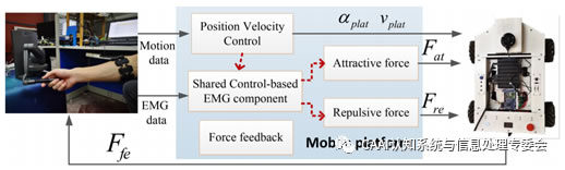 除了使用遙操作技術(shù)對機(jī)械臂或者機(jī)器手的控制,2020年西英格蘭大學(xué)的楊辰光團(tuán)隊(duì)提出了一種用于全向移動(dòng)機(jī)器人的EMG與觸覺設(shè)備混合控制方法[8]。這種混合共享控制方法基于肌電圖和人工勢場,用以根據(jù)排斥力和吸引力避開障礙物,并基于移動(dòng)平臺(tái)的力反饋增強(qiáng)人類對遠(yuǎn)程環(huán)境的感知。這種共享控制方法使遙操作者遠(yuǎn)程控制移動(dòng)機(jī)器人的運(yùn)動(dòng)并同步實(shí)現(xiàn)避障。與傳統(tǒng)的共享控制方法相比,該提議的方法提供了基于肌肉激活的力反饋,并驅(qū)動(dòng)操作者以可預(yù)測的方式更新其控制意圖。終通過各種避障實(shí)驗(yàn)表明這種遙控方法對移動(dòng)機(jī)器人控制的有效性。