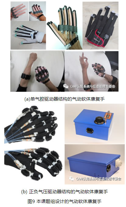 鑒于拉線式軟體康復手的驅(qū)動傳動系統(tǒng)較復雜、對手的壓迫感較強,液壓軟體康復手重量較大、有泄露污染的風險,本課題組對重量更輕、成本更低、驅(qū)動控制較為簡單的氣動軟體康復手展開了研究。前期,本課題組利用限制層和纖維約束的單氣腔驅(qū)動器結(jié)構(gòu)設計,并基于電容變化原理利用介電彈性材料制作柔性傳感器,設計了如圖9(a)所示的集成柔性傳感器的氣動軟體康復手,改變限制層方向,可以輔助人手分別實現(xiàn)主動伸展和主動屈曲運動,并檢測手指彎曲角度進行康復效果評估[13]。但是該氣動軟體康復手無法輔助人手實現(xiàn)拇指的內(nèi)收/外展運動,也無法同時實現(xiàn)伸展/屈曲運動的雙向主動訓練。為此,本課題組又利用波紋管制作的正負氣壓驅(qū)動器制作了如圖9(b)所示的氣動軟體康復手。該氣動軟體康復手僅有149克,采用開放式手套,通過欠驅(qū)動可以輔助手指實現(xiàn)伸展/屈曲運動和拇指的內(nèi)收/外展運動的主動訓練;配套的便攜式氣動箱體積小、重量輕,G級康復版氣動箱可調(diào)節(jié)六個輸出氣路的壓力和流量;實驗表明,伸展/屈曲驅(qū)動器在伸展時的大作用力為4.6N,內(nèi)收/外展驅(qū)動器在內(nèi)收時大作用力為8.1N。當前,該氣動軟體康復手的驅(qū)動器設計、控制設計仍在不斷地進行優(yōu)化。