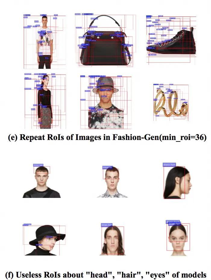 電商圖像產(chǎn)品單一,背景簡單提取 ROI 很少,如圖 1(c)。統(tǒng)計(jì)來看,通用L域 MsCoCo 數(shù)據(jù),每張圖像可以提取 19.8 個(gè) ROI,但是電商只能提取 6.4 個(gè) ROI。當(dāng)然我們可以強(qiáng)制提取小的 ROI,比如 ViLBERT 要求在 10~36 個(gè),VLBERT 要求 100 個(gè)。但是當(dāng)設(shè)定小提取的 ROI 后,又提取了太多了重復(fù)的 ROI,可以看圖 1(e)。