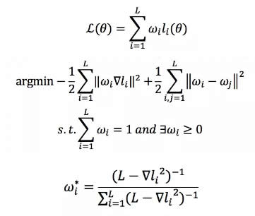 這是一個(gè)多任務(wù)學(xué)習(xí)問題,如何平衡這些任務(wù)的學(xué)習(xí)權(quán)重呢?另外,還有一個(gè)問題,目前很多實(shí)驗(yàn)指出 BERT 中 NSP 的效果并不一定非常有效,對終的結(jié)果的影響不是特別明朗。但是對于圖文匹配來說,Text and Image Alignment 這個(gè) loss 是至關(guān)重要的。那么如何平衡這幾個(gè)任務(wù)的學(xué)習(xí)呢?這里我們提出 adaptive loss 算法,我們將學(xué)習(xí)任務(wù)的權(quán)重看做是一個(gè)新的優(yōu)化問題,如圖 3 所示。FashionBERT 的 loss 是整體 loss 的加和,由于只有三個(gè)任務(wù),其實(shí)我們可以直接得到任務(wù)權(quán)重 W 的解析解(具體的求解過程可以參考我們論文,這里不再贅述)。