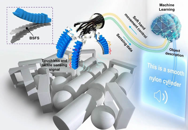 在人類感知世界的過(guò)程中,皮膚的多模態(tài)感知為我們感受真實(shí)的物理世界提供了重要的工具。正如人們用手指觸摸未知的物品,當(dāng)具有多模態(tài)感知能力的機(jī)器人手摩擦未知物品時(shí),機(jī)器人便能感知到物品的粗糙度;當(dāng)機(jī)器人手隔空拂過(guò)位置物品時(shí),它甚至能像X射線和3D掃描儀那樣感知到物品的材質(zhì)和形狀。因此,能夠感知環(huán)境的多模態(tài)傳感與擅長(zhǎng)交互的軟體機(jī)器人的結(jié)合必然能擦出火花。