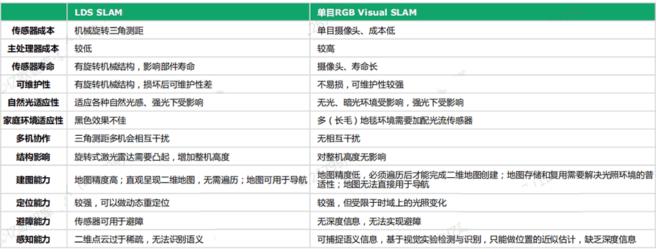 LDS SLAM 與 VSLAM 各有優(yōu)劣,二者相容或成為行業(yè)主流發(fā)展方向之一。對比 LDS SLAM 技術(shù)與單目 VSLAM 技術(shù),其中 LDS SLAM 技術(shù)可視范圍廣(VSLAM 只有50-60度),環(huán)境適應(yīng)性更強,地圖精度更G,同時能夠獲取深度信息,可以應(yīng)用于避障;而VSLAM技術(shù)成本更低,攝像頭的壽命長、不易損、不增加機身G度,同時能夠捕捉語義信息,提升地圖分區(qū)精度。