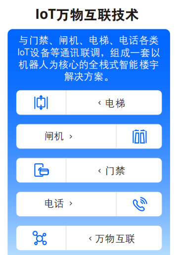 AIoT技術(shù)的核心在于通過物聯(lián)網(wǎng)技術(shù)支持服務(wù)機器人與各類設(shè)備(如電梯、 門禁系統(tǒng)、 電話系統(tǒng)等)建立實時連接 ,從而使機器人從孤立 的操作單元轉(zhuǎn)變?yōu)槎嗝婊ヂ?lián)的智能生態(tài)中的一 環(huán)。例如 ,在智能樓宇中 ,服務(wù)機器人可以通 過IoT技術(shù)與電梯系統(tǒng)聯(lián)動,實現(xiàn)自主乘梯,為 用戶帶來全棧式的智能服務(wù)體驗。