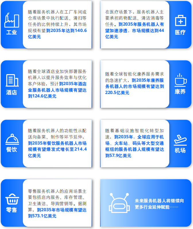 隨著基礎(chǔ)設(shè)施智能化轉(zhuǎn)型加 速,到2035年,應(yīng)用于機(jī) 場、火車站、碼頭等大型交通 樞紐的服務(wù)機(jī)器人規(guī)模有望達(dá) 到57.9億美元