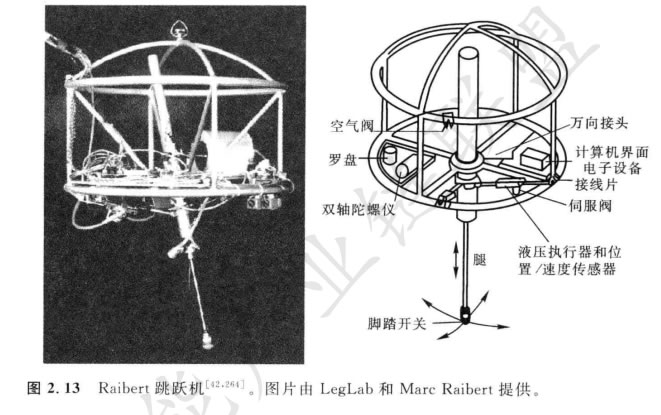 圖2.13表示的是Raibert 跳躍機(jī)42,2647,它是已制作的Z有名的單腿跳躍機(jī)器人 之一。這個機(jī)器人通過調(diào)節(jié)相對于身體的腿角,不斷地修正身體姿態(tài)和機(jī)器人速度。 激勵是液壓的,包括在立姿向空中跳躍期間腿的高性能縱向伸展。激勵雖然是強(qiáng)有 力的,但這些激勵器需要一個隨時連接到機(jī)器人的大型的、外裝的液壓泵。
