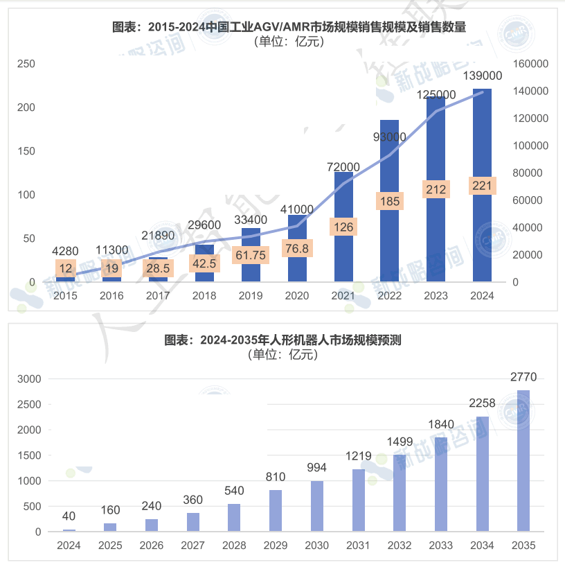 根據(jù)新戰(zhàn)略移動(dòng)機(jī)器人產(chǎn)業(yè)研究所統(tǒng)計(jì), 2024年ZG工業(yè)應(yīng)用移動(dòng)機(jī)器人銷售規(guī)模為221億, 同比增長4.25%; 銷售數(shù)量為139000臺(tái), 同比增長1 1.2% ZG市場人形機(jī)器人出貨量超2800臺(tái), 市場規(guī)模超20億; 清潔及環(huán)衛(wèi)機(jī)器人累計(jì)出貨超12900臺(tái) (不含小型家用墻面清潔泳池清潔機(jī)器人) , 市場銷售規(guī)模約 27.6億元。 2024年, ZG智能移動(dòng)機(jī)器人整體市場已突破300億元。