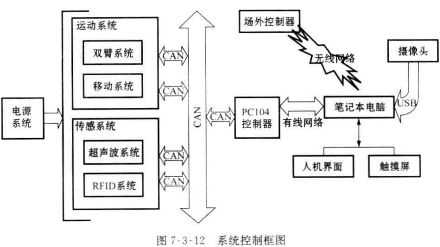 展廳機(jī)器人系統(tǒng)各硬件模塊主要由CAN 總線連接,通過統(tǒng)一的CAN總線協(xié)議將各模塊簡(jiǎn)單地加載到系統(tǒng)中。系統(tǒng)主要由電源系統(tǒng)、運(yùn)動(dòng)控制系統(tǒng)、傳感系統(tǒng)等組成,其中運(yùn)動(dòng)控制系統(tǒng)包括雙臂系統(tǒng)及移動(dòng)系統(tǒng),傳感器系統(tǒng)包括超聲波系統(tǒng)、RFID定位系統(tǒng)、視覺系統(tǒng)組成。具體結(jié)構(gòu)由圖7-3-12所示。