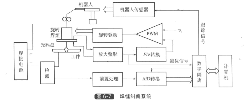 在弧焊機(jī)器人的第6個(gè)關(guān)節(jié)上,安裝一個(gè)焊炬夾持件,將原來(lái)的焊炬卸下,把高速旋轉(zhuǎn)掃描電弧傳感器安裝在焊炬夾持件上。焊縫糾偏系統(tǒng)如圖6-7所示,高速旋轉(zhuǎn)掃描電弧傳感 器的安裝姿態(tài)與原來(lái)的焊炬姿態(tài)一樣,即焊絲端點(diǎn)的參考點(diǎn)的位置及角度保持不變。