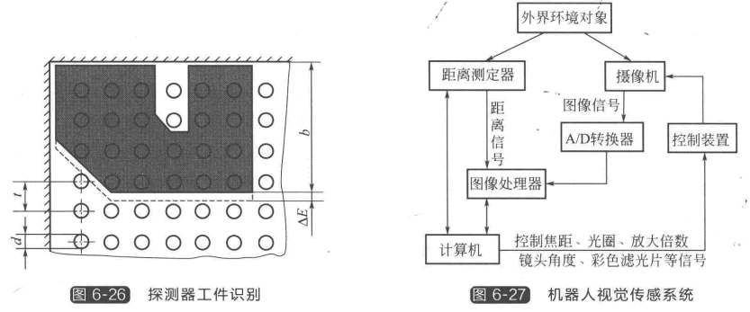 圖6-27所示為機(jī)器人視覺傳感系統(tǒng)的原理。攝像機(jī)獲取環(huán)境對(duì)象的圖像,經(jīng) A/D 轉(zhuǎn) 換 器轉(zhuǎn)換成數(shù)字量,從而變成數(shù)字化圖形。通常一幅圖像劃分為512×512或者256×256,各 點(diǎn)亮度用8位二進(jìn)制表示,即可表示256個(gè)灰度。圖像輸入以后進(jìn)行各種處理、識(shí)別以及理解,另外通過距離測(cè)定器得到距離信息,經(jīng)過計(jì)算機(jī)處理得到物體的空間位置和方位;通過 彩色濾光片得到顏色信息。上述信息經(jīng)圖像處理器進(jìn)行處理,提取特征,處理的結(jié)果再輸出 到機(jī)器人,以控制它進(jìn)行動(dòng)作。另外,作為機(jī)器人的眼睛不但要對(duì)所得到的圖像進(jìn)行靜止處 理,而且要積極地?cái)U(kuò)大視野,根據(jù)所觀察的對(duì)象,改變眼睛的焦距和光圈。因此,機(jī)器人視 覺系統(tǒng)還應(yīng)具有調(diào)節(jié)焦距、光圈、放大倍數(shù)和攝像機(jī)角度的裝置。