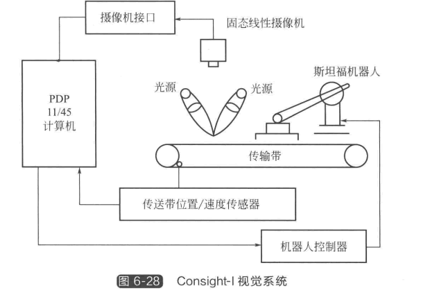 ③Consight-I視覺系統(tǒng) 圖6-28所示 Consight-I視覺系統(tǒng),用于美國(guó)通用汽車公司的 制造裝置中,能在噪聲環(huán)境下利用視覺識(shí)別抓取工件。