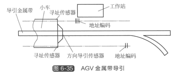 如圖6-34(c) 所示,以鐵氧磁體與樹脂組成的磁帶代替漆帶,AGV 上裝有磁性感應器, 形 成 了 磁 帶 導 引 方 式 。