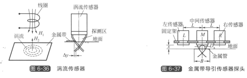 金屬帶導引如圖6-35所示,在地面預定的行駛路徑上鋪設極薄的金屬帶,金屬帶可以 用鋁材,用膠將其牢牢地粘在地面上。采用能檢測金屬的傳感器作為方向導引傳感器,用于 AGV 與路徑之間相對位置改變信號的檢測,通過一定的邏輯判斷,控制器發(fā)出糾偏指令, 從而使 AGV 沿著金屬帶鋪設的路徑行走,完成工作任務。作為檢測金屬材料的傳感器,常 用的有渦流型、光電型、霍爾型和電容型等。渦流型傳感器對所有金屬材料都起作用,對金 屬帶表面要求也不高,故采用渦流型傳感器檢測金屬帶為好,如圖6-36所示。圖6-37表示 一組方向導引傳感器,由左、中、右三個渦流型傳感器組成,并用固定支架安裝在小車的前 部。金屬帶導引是一種無電源、無電位金屬導引,既不需要給導引金屬帶供給電源信號,也 不需要將金屬帶磁化,金屬帶粘貼非常方便,更改行駛路徑也比較容易,同時在環(huán)境污染的 情況下,導引裝置對金屬帶仍能有效地起作用,并且金屬帶極薄,并不造成地面障礙。所 以,與其他導引方式比較,金屬帶導引是固定路徑導引方式中可靠性高、成本低、簡單靈 活,適合工程應用的一種 AGV 導引技術。