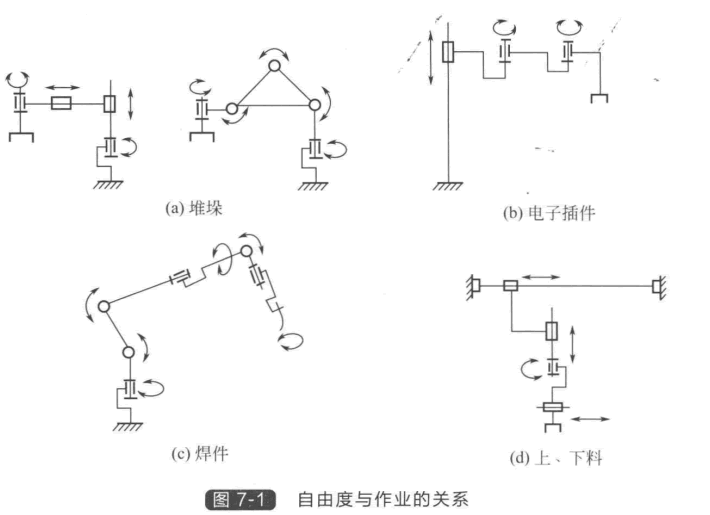 ③確定機(jī)器人的自由度。機(jī)器人在持重和工作空間上滿足對(duì)機(jī)器人工作站或生產(chǎn)線的 功能要求之后,還要分析它是否可以在作業(yè)范圍內(nèi)滿足作業(yè)的姿態(tài)要求。如圖7 - 1(a) 所 示 的簡(jiǎn)單堆垛作業(yè),作為末端執(zhí)行器的夾爪,只需繞垂直軸的1個(gè)旋轉(zhuǎn)自由度,再加上機(jī)器人 本體的3個(gè)圓柱坐標(biāo)自由度,4個(gè)自由度的圓柱坐標(biāo)機(jī)器人即可滿足要求。若用垂直關(guān)節(jié)型 機(jī)器人,由于上臂常向下傾斜,又需手腕擺動(dòng)的自由度,故需5個(gè)自由度的垂直關(guān)節(jié)型機(jī)器 人。圖7 - 1(b) 表示電子插件作業(yè),常使用4個(gè)自由度水平關(guān)節(jié)的SCARA 機(jī)器人。為了焊 接復(fù)雜工件, 一 般需要6個(gè)自由度。如果焊體簡(jiǎn)單,又使用變位機(jī),在很多情況下5個(gè)自由 關(guān)節(jié)機(jī)器人即可滿足要求。自由度越多,機(jī)器人的機(jī)械結(jié)構(gòu)與控制就越復(fù)雜,所以在通常情 況下,如果少自由度能完成的作業(yè),就不要盲目選用更多自由度的機(jī)器人去完成。