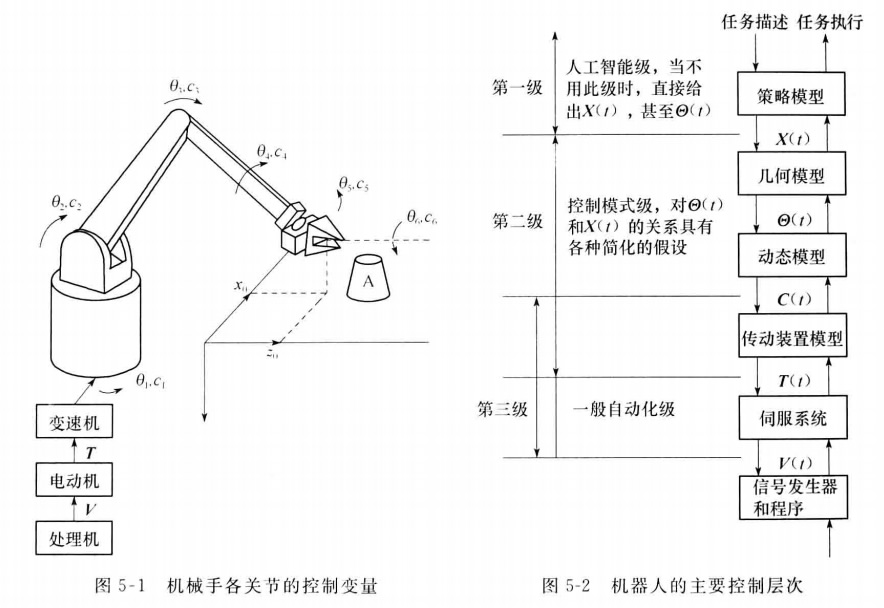圖5-2表示機(jī)器人的主要控制層次。由圖可見,它主要分為三個控制J,即人工智能 J、控制模式J和伺服系統(tǒng)J。現(xiàn)對它們進(jìn)一步討論如下。