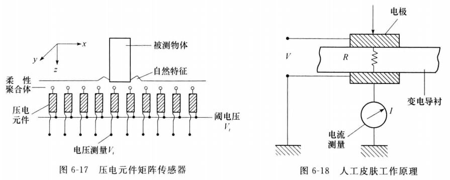 這種傳感器的壓敏元件是埋放在彈性聚合體內(nèi),見圖6-17。測(cè)量輸出電壓V, 就能夠獲得物體作用力形成的映像 。