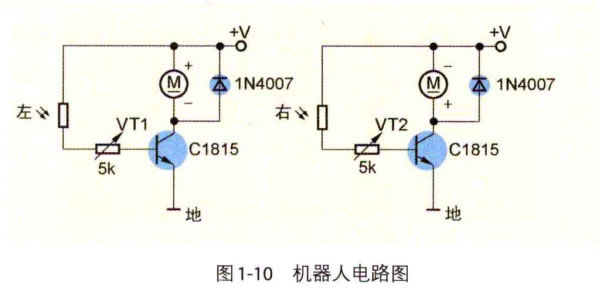 機器人電路圖如圖1-10所示,這個電路看起來非常簡單,加上電機, 一共只有 10個元件,從電路角度分析,不過就是一對光電開關(guān)控制兩個電機,彼此互不干 擾。但是把整個電路安裝在一個可以活動的底盤上,情況就會大不一樣。