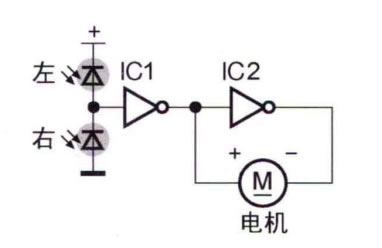 讓我們試著用“低技術”的方式進行思考, 一個可以在二維平面上跟蹤光線的 伺服系統(tǒng)可以有多簡單呢?請看圖1-14,只需要4個元器件:兩個光敏二極管、 一 片數(shù)字邏輯集成電路、一個減速電機。這些元器件都是電子愛好者工作室里常備的 材料,它們真的可以制作出一個能夠正常工作的自動控制系統(tǒng)嗎?答案是肯定的, 這個電路可以作為學習自動控制系統(tǒng)的一塊敲門磚。