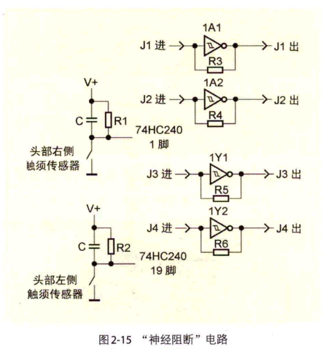 為了簡(jiǎn)化問(wèn)題,我們以常見(jiàn)的避障功能為例,讓機(jī)器人可以對(duì)前方出現(xiàn)的物體 做出規(guī)避。在圖2-11所示的電路里,我設(shè)置了4個(gè)斷點(diǎn)——J1 、J2 、J3和J4 。在前面 的試驗(yàn)中,它們是連通的,這樣才能形成一個(gè)完整的CPG網(wǎng)絡(luò)。現(xiàn)在要在網(wǎng)絡(luò)中插 入一個(gè)由接觸式傳感器觸發(fā)的“神經(jīng)阻斷”電路,如圖2-15所示。