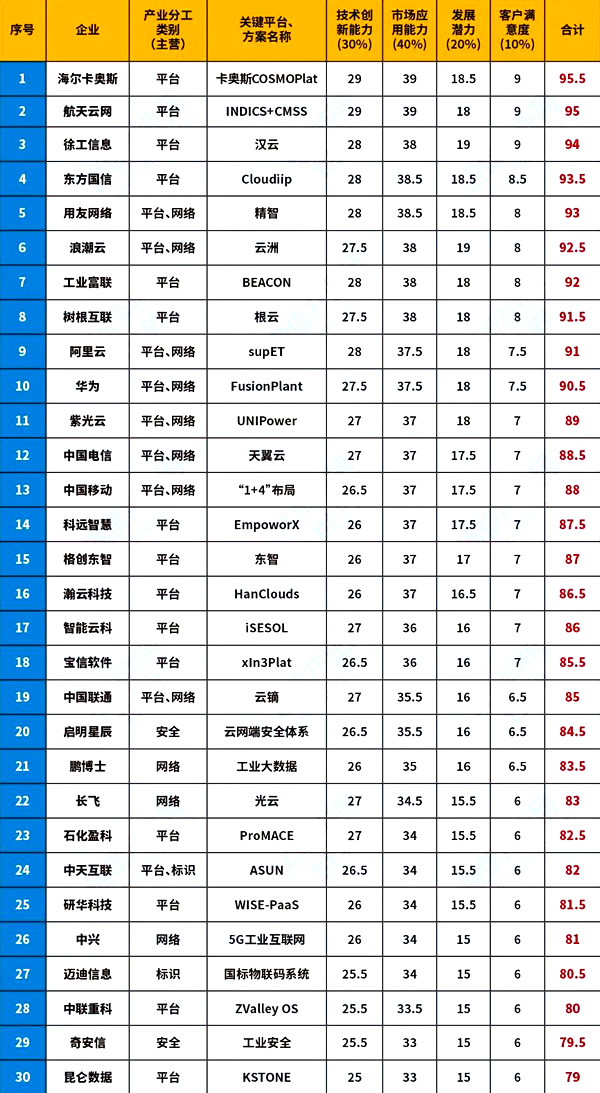 | 1 | 海爾卡奧斯 | 平臺(tái) | 卡奧斯COSMOPlat | 29 | 39 | 18.5 | 9 | 95.5 |