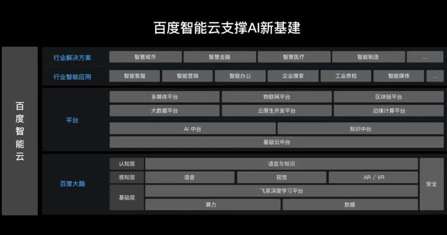 6月11日,百度發(fā)布AI新基建版圖,目標成為中國新基建AI服務大提供商。依托百度大腦、飛槳深度學習平臺、百度智能云、芯片、量脈、超級鏈等在內(nèi)的新型AI基礎設施,百度在智慧城市、智能交通、智慧金融、智能客服與營銷、智慧能源、智慧醫(yī)療、智能汽車、工業(yè)互聯(lián)網(wǎng)和智能制造等八大L域推動產(chǎn)業(yè)智能化升級。