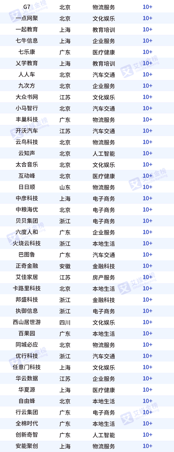字節(jié)跳動(dòng),螞蟻金服,滴滴出行,快手,陸金所,菜鳥網(wǎng)絡(luò),京東數(shù)科,微眾銀行,馬上金融,商湯科技,京東物流,曠視科技,優(yōu)必選