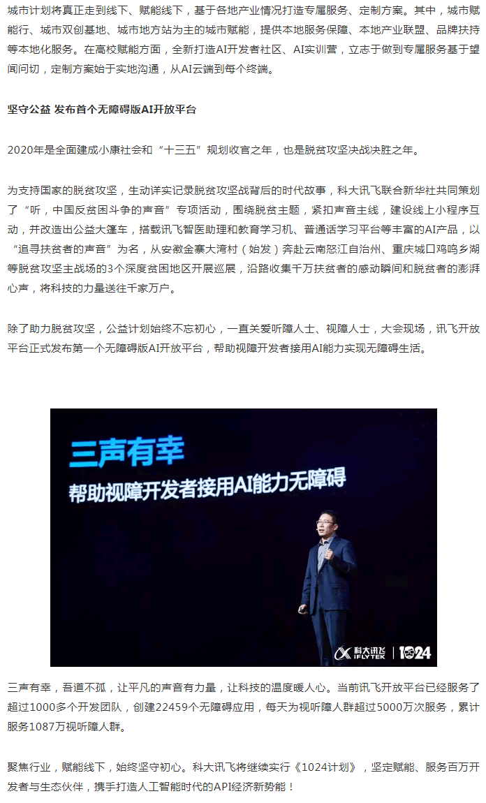 科大訊飛1024計(jì)劃全新升級(jí)為“AI賦能計(jì)劃”,發(fā)布聚焦行業(yè)的先導(dǎo)計(jì)劃、賦能線下的城市計(jì)劃、堅(jiān)守初心的公益計(jì)劃。“我們將從產(chǎn)品賦能走向行業(yè)賦能,實(shí)現(xiàn)進(jìn)階服務(wù),為生態(tài)和應(yīng)用的發(fā)展提供更契合的A.I.源動(dòng)力。” 胡國平表示。