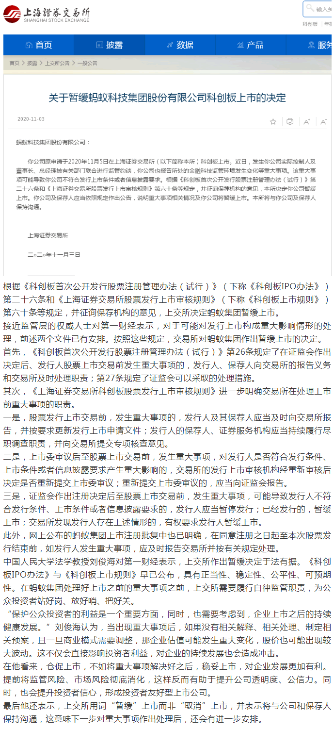 11月3日,上海證券交易所(下稱“上交所”)發(fā)布了《關(guān)于暫緩螞蟻科技集團(tuán)股份有限公司科創(chuàng)板上市的決定》。