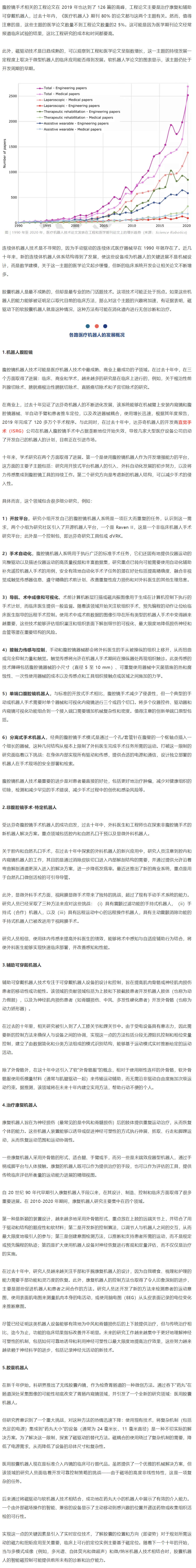 數據顯示,工程和醫(yī)學期刊上關于醫(yī)療機器人的出版物數量呈指數級增長,從 1990 年的 6 篇增至 2020 年的 3500 多篇。醫(yī)學期刊論文主要是關于腹腔鏡機器人的出版物(占總數的 60% 至 70%),伴隨著達芬奇外科手術機器人系統的成功,2020 年發(fā)表的相關論文超過 1300 篇。