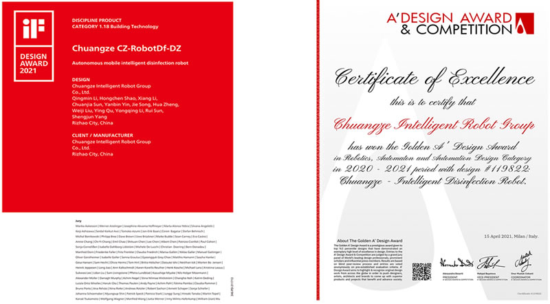 ◇在:創(chuàng)澤是榮獲國際CES創(chuàng)新獎(jiǎng)的商用類人型智能服務(wù)機(jī)器人企業(yè),也是國內(nèi)榮獲德國歷史悠久的2021年iF 設(shè)計(jì)獎(jiǎng)的移動(dòng)式消毒機(jī)器人企業(yè);同年,創(chuàng)澤榮獲意大利A'Design Award金獎(jiǎng)。
