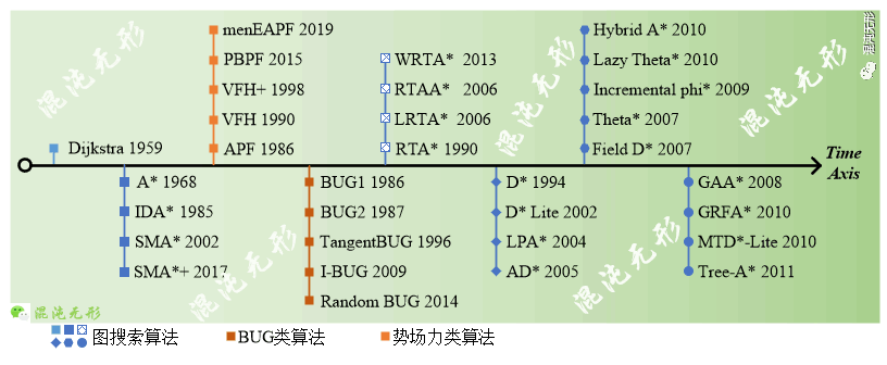 圖規(guī)劃算法根據路徑生成方式的不同分為三類,其中以圖搜索算法為主,以及BUG算法和勢場力算法。