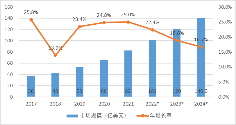 2017 年以來, 特種機器人產(chǎn)業(yè)規(guī)模年均增長率達到 21.7%, 預(yù)計 2022 年特種機器人市場規(guī)模超過 100 億美元, 2024 年特 種機器人市場規(guī)模將有望達到 140 億美元。