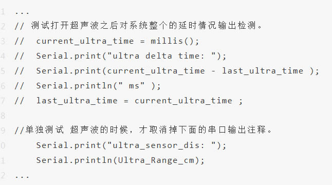 該程序定義了一個(gè)存儲(chǔ)測(cè)距信息的變量 Ultra_Range_cm , 測(cè)距范圍為“0-1m”。此時(shí),我們可以看見(jiàn)下面有兩大段注釋。其中,D一段是用來(lái)測(cè)試整個(gè)系統(tǒng)功能執(zhí)行一遍所需要的時(shí)間,若取消掉注釋,即可在 串口監(jiān)視器 實(shí)時(shí)查看輸出的時(shí)間信息。