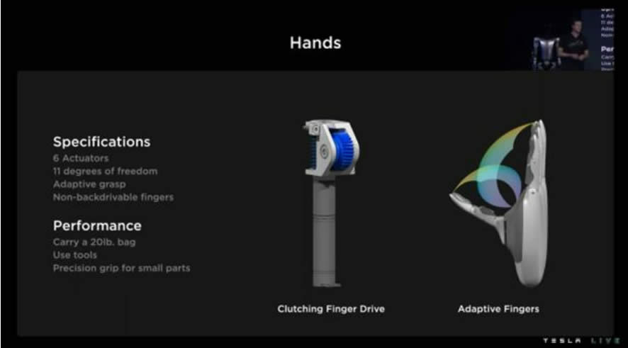 “擎天柱”全身約 50 個自由度,手指靈敏度G,能夠滿足多種規(guī)格的物體抓取需求。機器人單手具有 6 個執(zhí)行器,11 個自由度,在對生拇指與金屬肌腱的配合 下,“擎天柱”能夠完成對不同重量和大小的物件的抓握。同時,特斯拉機械手搭載能夠驅(qū) 動手指感知物體的傳感器,幫助其識別需要抓握的物體,并在不斷的抓握過程中學習提G 機械手適應性。
