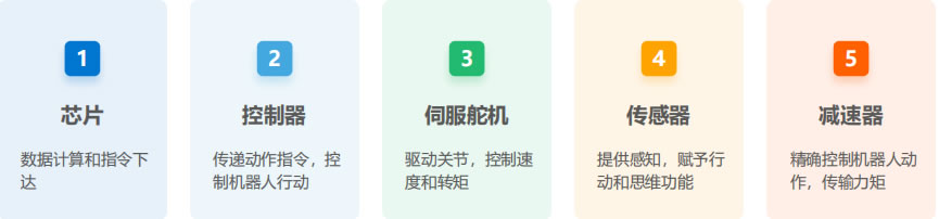 1G性能減速器;2G性能伺服驅(qū)動(dòng)系統(tǒng);3智能控制器;4智能一體化關(guān)節(jié);5新型傳感器;6智能末端執(zhí)行器