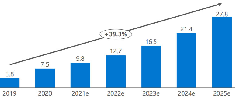 受新G疫情的防疫需求帶動(dòng),加之清潔行業(yè)長(zhǎng)期面臨招工難、人力成本G等 痛點(diǎn),商用清潔機(jī)器人的市場(chǎng)需求愈發(fā)旺盛。特別是具備智能消毒功能的清 潔機(jī)器人,通過集成消毒液自動(dòng)噴灑系統(tǒng),實(shí)現(xiàn)全域噴霧消殺,可以有效降 低人力工作強(qiáng)度和交叉感染風(fēng)險(xiǎn),已在地鐵站、機(jī)場(chǎng)、辦公區(qū)、展館、酒店 等場(chǎng)景加速落地應(yīng)用。在需求驅(qū)動(dòng)下,商用清潔機(jī)器人的市場(chǎng)規(guī)模快速增長(zhǎng)。 2019年中國商用清潔機(jī)器人的市場(chǎng)規(guī)模約3.8億元,預(yù)計(jì)2021年將達(dá)到9.8 億元,2025年將達(dá)到27.8億元,年復(fù)合增長(zhǎng)率約39.3%*。