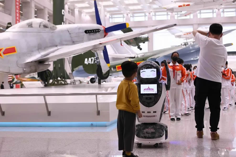 創(chuàng)澤博物館服務機器人“創(chuàng)創(chuàng)”亮相中國人民革命軍事博物館,每天為觀眾提供軍事科普講解、信息查詢等服務。除了常規(guī)的語音介紹,機器人還能隨機播放館藏戰(zhàn)機重要歷史時刻的音視頻畫面,呈現(xiàn)出集聲音畫面于一體全景式講解。