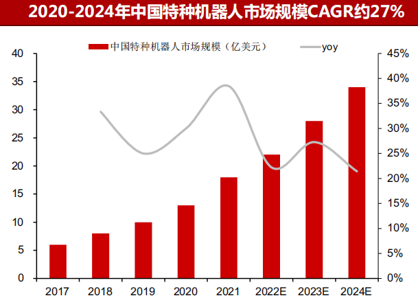 中國機(jī)器人2024年有望達(dá)251億美元市場規(guī)模,2020-2024年CAGR約22%。