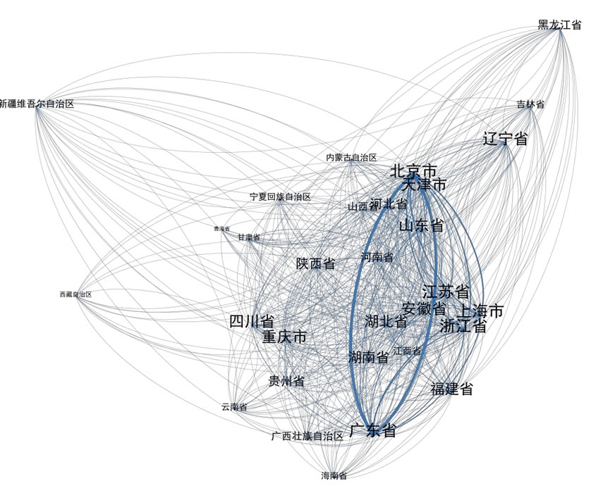 從人工智能產(chǎn)業(yè)區(qū)域競爭力評價指數(shù)和技術(shù)合作關(guān)系的分布密度看,中國 人工智能產(chǎn)業(yè)集群的空間結(jié)構(gòu)是“J核”狀網(wǎng)絡(luò)。北京市、廣東省、上海市、 浙江省和江蘇省構(gòu)成了價值網(wǎng)絡(luò)的核心節(jié)點。
