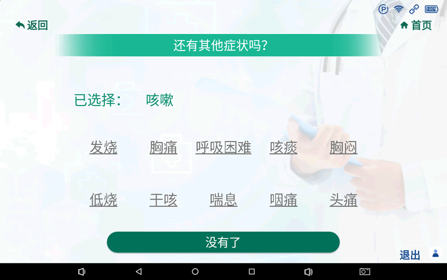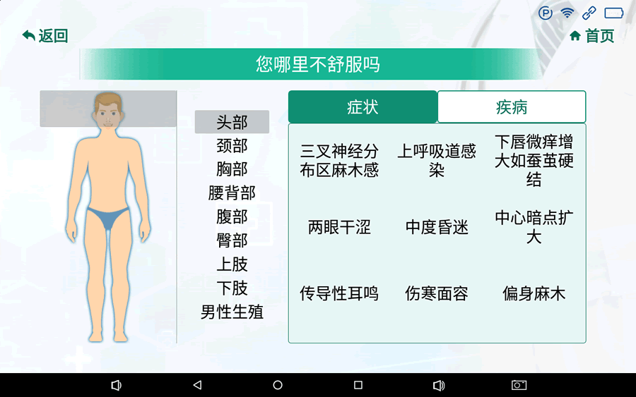 1.通過點擊首頁預(yù)檢分診按鈕或語音“預(yù)檢分診”進入性別和年齡選擇頁面,通過點擊屏幕或直接語音如(30歲男性)選擇患者的性別和年齡,然后跳轉(zhuǎn)到癥狀或疾病選擇頁面;