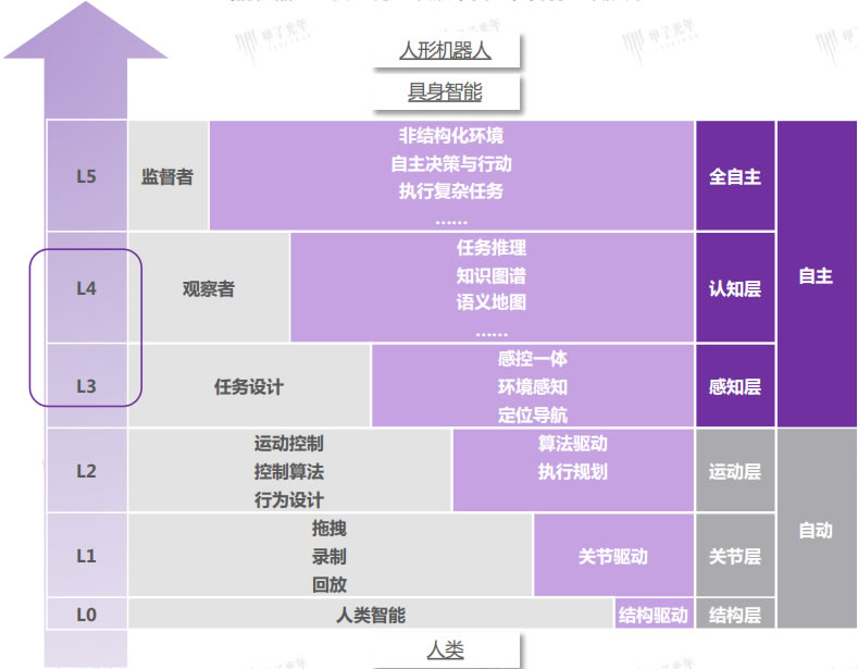 第三代為智能機器人(L4-L5):擁有更豐富的傳感器和更G的智能水平,不僅能獲取并處理外部綜合信息,甚至能據此自己制定行動目標,其智能主要體現(xiàn)在感知交互、獨立決策、自我優(yōu)化三個方面。