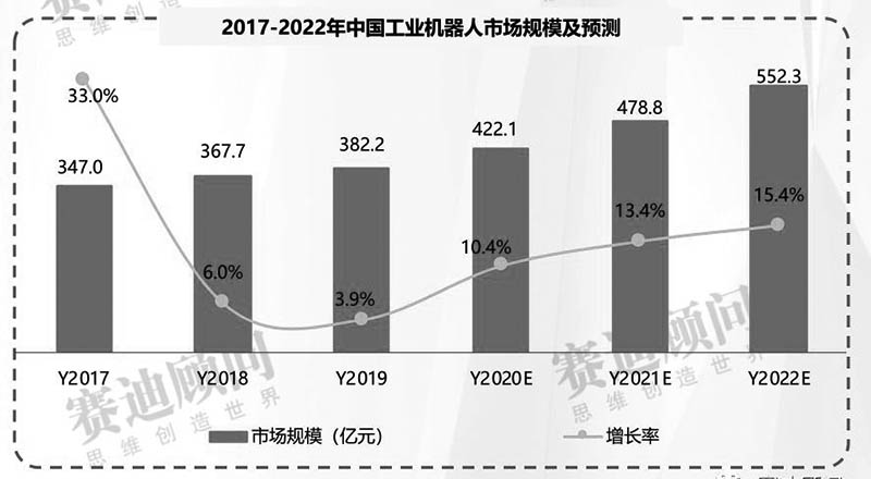 2019年,工業(yè)機(jī)器人市場(chǎng)規(guī)模受下游汽車(chē)、電子電氣等行業(yè)景氣度下滑的影響,增速較上年放緩,呈現(xiàn)下降趨勢(shì),但總體市場(chǎng)規(guī)模仍然呈現(xiàn)穩(wěn)定上升趨勢(shì),達(dá)382.2億元,預(yù)計(jì)到2022年,工業(yè)機(jī)器人市場(chǎng)規(guī)模將進(jìn)一步增長(zhǎng),達(dá)到552.3億元 。