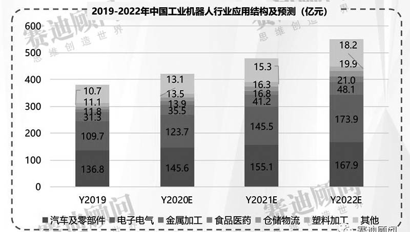 未來(lái)三年,工業(yè)機(jī)器人行業(yè)應(yīng)用結(jié)構(gòu)的總體格局基本保持不變。到2022年,汽車(chē)及零部件、電子電氣仍然占據(jù)大比重,隨著制造業(yè)轉(zhuǎn)型升級(jí)進(jìn)程的不斷加速,將為金屬加工、食品醫(yī)藥、倉(cāng)儲(chǔ)物流等應(yīng)用行業(yè)帶來(lái)更大的市場(chǎng)空間。